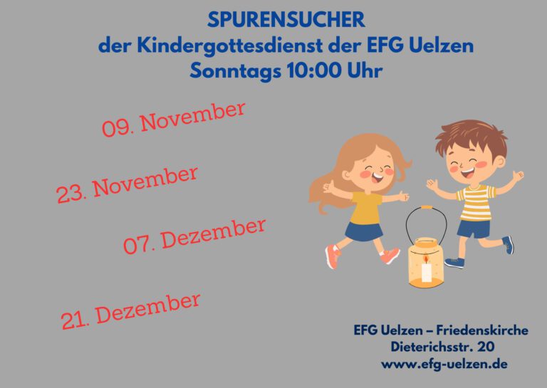 Eine Predigt, die für alle ansprechend ist und manchmal auch visuell unterstützt wird. Auch das Gebet füreinander, ob gemeinsam oder jeder für sich, ist ein fester Bestandteil in unserem Gottesdienst. Wir singen gerne: Unser Lobpreis besteht aus älteren Gemeindeliedern und einer modernen Lobpreiszeit. Einmal monatlich feiern wir zusammen das Abendmahl. Parallel zum Gottesdienst findet zur Zeit zweiwöchig unser Kindergottesdienst, die „Spurensucher“, statt. Dieser ist für Kinder zwischen 4 und 12 Jahren geeignet. Für Eltern mit kleineren Kindern ist ein Eltern-Kind-Raum mit Tonübertragung und Sicht auf den Gottesdienstraum vorhanden. Im Anschluss an den Gottesdienst besteht die Möglichkeit, ein persönliches Gespräch und Gebet in Anspruch zu nehmen. Ab sofort gibt es wieder alle 14 Tage Kaffee nach dem Gottesdienst; eine schöne Möglichkeit, miteinander über das Erlebte ins Gespräch zu kommen.